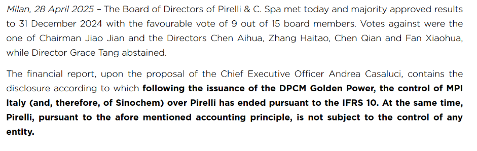 根据倍耐力首席执行官 Andrea Casaluci 的提案,财务报告中有着这样的披露:自 “黄金权力” 法案实施后,依据国际财务报告准则第 10 号(IFRS 10),MPI Italy(以及中化集团)对倍耐力的控制已然终止。同时,按照上述会计原则,倍耐力如今不受任何实体的控制。在 “黄金权力” 法案颁布后,法定审计师和管理层委员会率先对中化集团通过 Marco Polo International Italy Srl(MPI Italy)对倍耐力的控制权存疑,在审计和主要律师事务所助力下,针对此问题展开了深入剖析。而此次决定也契合 Consob(意大利证券交易所委员会)的规定,该委员会已将相关评估反馈给董事会,并依据 IFRS 10 进行评估。不过,投反对票或弃权票的董事会成员,仅仅是对根据 IFRS 10 宣布中化集团对倍耐力控制权终止这一声明持有异议,并不认同相关理由。他们还考虑到 Camfin 与中国化工橡胶有限公司(CNRC)/MPI Italy 之间的股东协议依旧生效,所以在这些成员看来,依据《统一金融法典》(TUF)第 93 条,CNRC/MPI Italy 对倍耐力依旧保持着控制权。这里需要说明的是,CNRC 是中国中化的子公司。