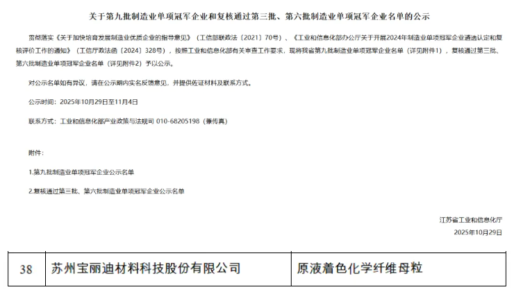 近日,江苏省工业和信息化厅发布了新一批制造业单项冠军企业榜单,苏州宝丽迪材料科技股份有限公司凭借在纤维母粒领域的突出成就,荣获这一国家级殊荣。