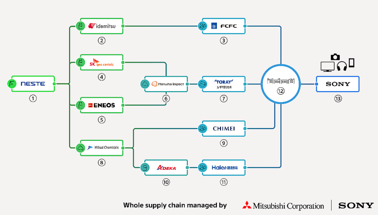 注:① 可再生石脑油生产—Neste / ② 可再生苯乙烯单体生产—出光兴产株式会社 / ③ 可再生聚苯乙烯树脂生产—台湾化学纤维股份有限公司 / ④ 可再生对二甲苯生产—SK Geo Centric株式会社 / ⑤ 可再生对二甲苯生产— ENEOS株式会社 / ⑥ 可再生对苯二甲酸生产—Hanwha Impact / ⑦ 可再生PET树脂生产—东丽先进材料韩国株式会社 / ⑧ 可再生双酚A生产—三井化学株式会社 / ⑨ 可再生聚碳酸酯(PC)树脂生产—奇美实业 / ⑩ 可再生阻燃剂生产—艾迪科株式会社 / ⑪ 可再生PC/ABS树脂生产 —青岛海尔新材料研发有限公司 / ⑫ 模具制造商 / ⑬ 成品设计与制造—索尼(Sony)。