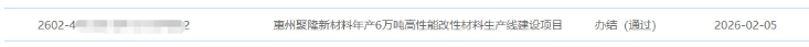 2月5日,惠州聚隆新材料年产6万吨高性能改性材料生产线建设项目备案通过。