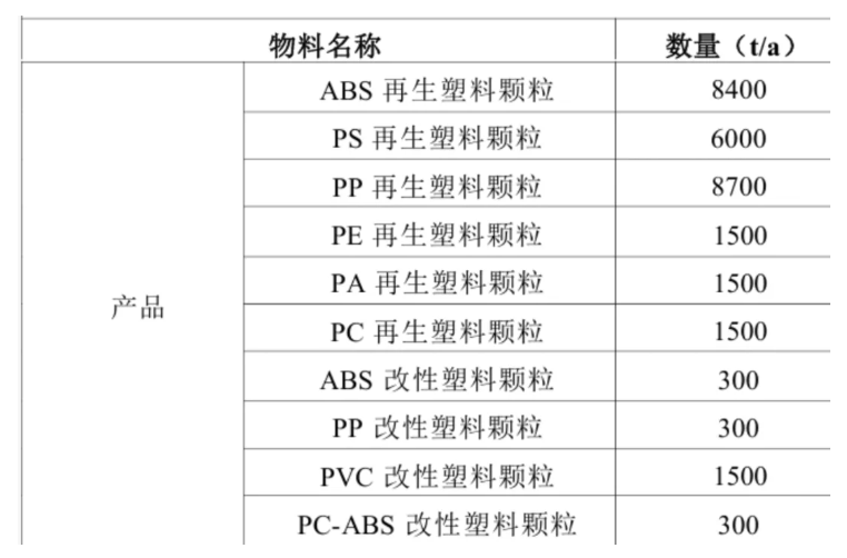 项目运营期产品为各类塑料颗粒及塑料零件,其中注塑生产线年产塑料零件193吨,造粒生产线具体生产内容如下: