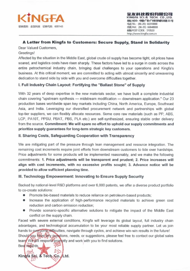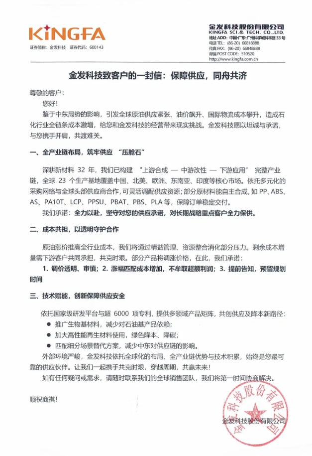 金发科技在公司微信公众号发布致客户信,受中东局势影响,全球原油供应紧张、油价及物流成本攀升,行业成本激增,公司部分产品将上调价格。同时,公司承诺调价透明审慎,涨幅匹配成本增加,不牟取超额利润,并提前告知预留规划时间。