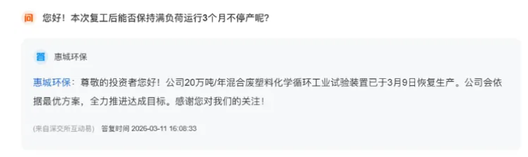 3月11日,惠城环保透露,公司20万吨/年混合废塑料化学循环工业试验装置于3月9日正式恢复生产。