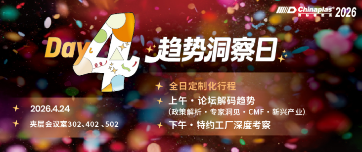 准备好探索由创新驱动的橡塑世界了吗?万众瞩目的“CHINAPLAS 2026国际橡塑展”即将于4月21 - 24日在上海·国家会展中心(虹桥)盛大举行。来自世界各地的5000多家参展商将带来橡塑科技创新解决方案。展会同期还精心打造一系列精彩纷呈的活动,从技术交流、应用创新、采供对接、趋势洞察、参观工厂到产学研融合、人才对接等,搭建全方位、深层次的交流合作桥梁,多维度解锁行业创新的奥秘与商机,推动橡塑产业智造升级与高质量发展。
