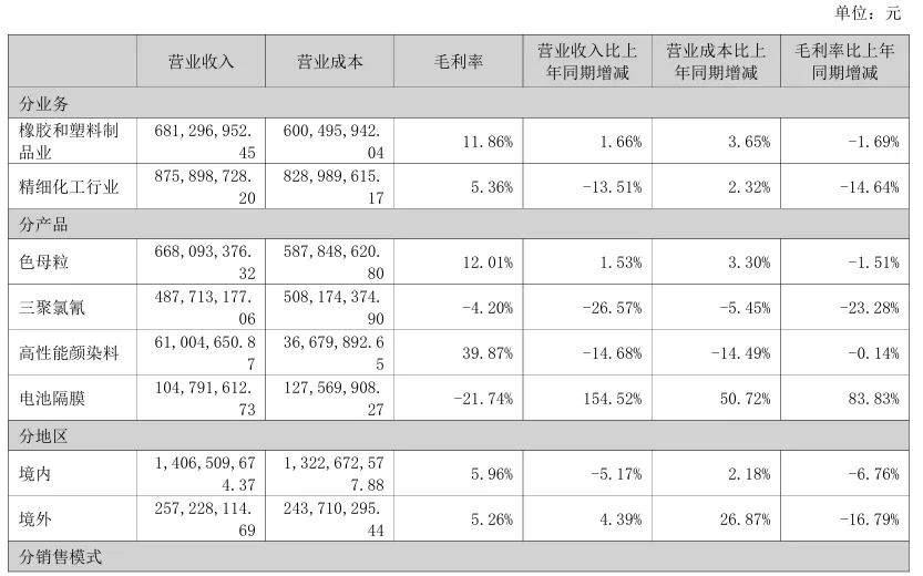 色母粒作为公司核心业务,2025年营收6.68亿元,占总营收40.16%,同比微涨1.53%,毛利率12.01%。